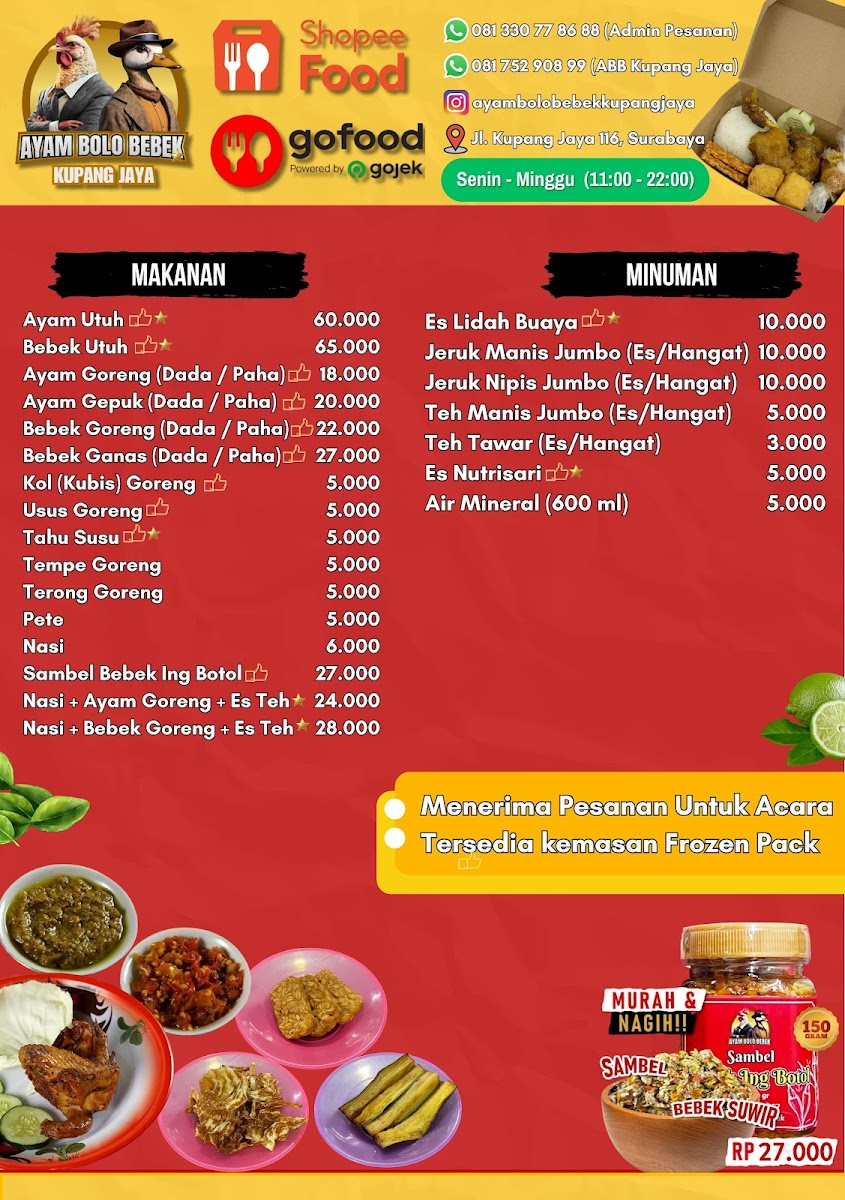 Introducing Ayam Bolo Bebek Kupang Jaya: a culinary gem nestled in Surabaya’s bustling streets at Jl. Kupang Jaya No.116. This eatery has quickly made a name for itself, specializing in delectable Indonesian dishes, particularly their famed bebek (duck) and ayam (chicken) dishes. Diners rave about the rich flavors, with the sambal being a standout element that complements the tender, well-spiced meats.